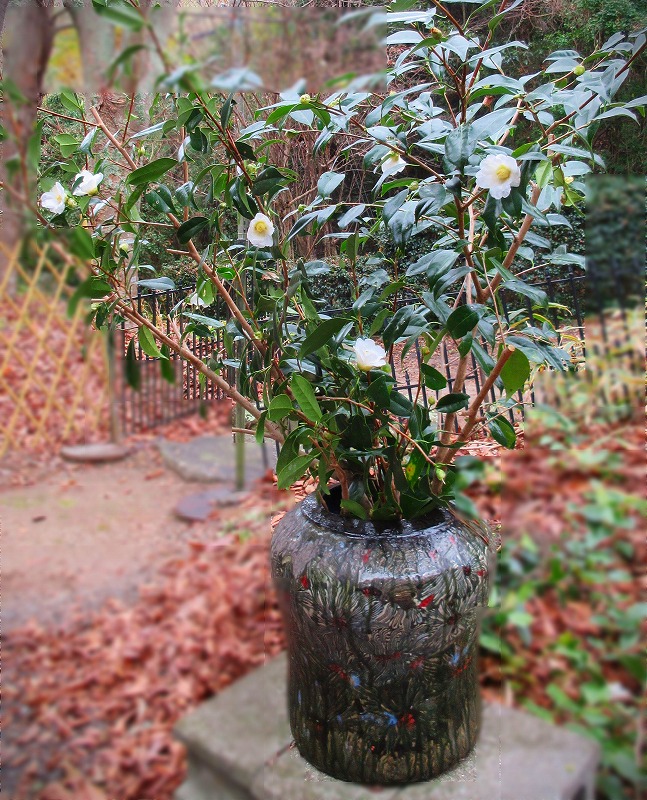 今年は庭の「侘助」がいつもより早くたくさん咲きました。作家Aが会場前の壺にがっつりと活けたのが、期間中ずっと咲き続けて楽しませてくれました。
